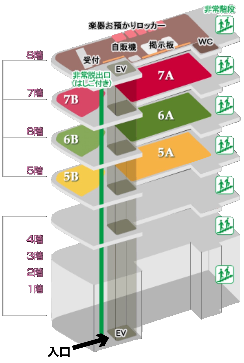 各Bルームは個人練習やレッスンはもちろん、バンドでも